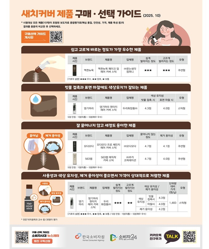 한국소비자원이 소비자 선호도가 높은 새치커버 10개 제품의 품질·안전성의 시험 평가 내용을 공개했다. 해당 제품은 립스틱처럼 돌려쓰며 새치에 발라 사용하는 스틱형 6개, 쿠션(스펀지)에 색상을 묻힌 후 새치에 바르는 쿠션형 4개 등이었다.