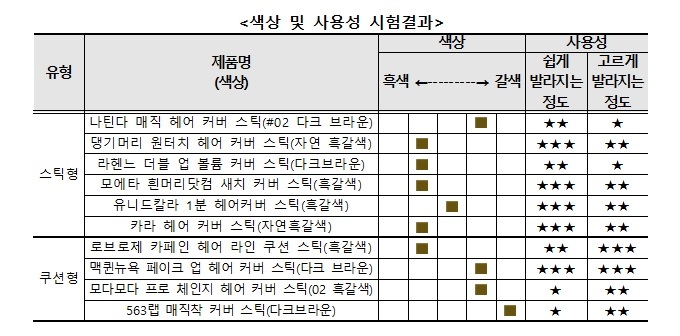 사용성이 우수한 제품은 맥퀸뉴욕 페이크 업 헤어 커버스틱 제품이었다. 발림성이 좋은 제품은 스틱형(쉽게 발림)이 4개, 쿠션형(고른 발림)이 2개였다. 시험대상은 모두 흑갈색(다크브라운)으로 표시된 제품이었으나, 발랐을 때 어둡고 밝은 정도는 제품별로 달라 사용자의 머리카락 색상에 맞는 제품을 선택할 필요가 있었다.
