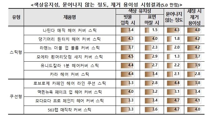 쉽게 색이 묻어나지 않는 정도(5.0 만점)는 상대적으로 쿠션형에서 우수한 제품이 많았다. 일시적으로 사용하는 커버 제품은 사용 후 깨끗하게 제거될수록 청결한 모발관리에 도움이 된다.