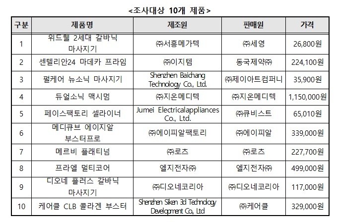 한국소비자원의 피부 개선 효과를 표방하는 핸디형 피부관리기 10개 제품의 안전성과 표시·광고 실태를 조사한 결과다.