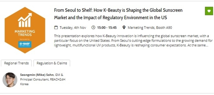 같은 날 오후 15시에 손 대표는 ‘K-뷰티가 글로벌 자외선 차단제 시장을 형성하는 방식과 미국 규제 환경의 영향’을 주제로 발표에 나선다. 이번 발표에서는 미국에서 ▲ K-뷰티 혁신이 글로벌 자외선 차단제 시장에 어떤 영향을 미치고 있는지 ▲ 한국의 최첨단 성분부터 가볍고 다기능의 자외선 차단제에 대한 수요 증가 ▲ 미국의 규제 체계, 특히 MoCRA와 FDA OTC 요건 비교 분석 ▲ OTC 제조소 GMP 규제 대응 등 미국 자외선 차단 제품 규제 대응에 특화된 정보를 종합하여 설명한다.