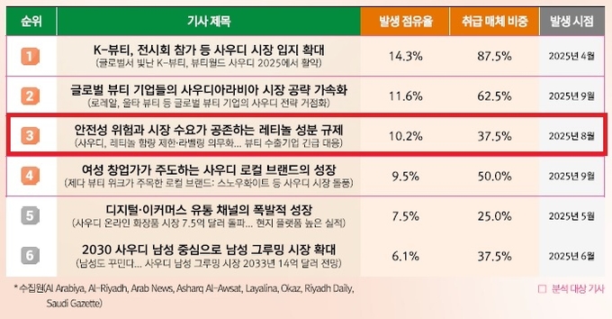 이에 대해 연구원은 “영국과 사우디아라비아 모두 자국 소비자 보호를 위해 규제를 재편하는 중이다”라며, “영국 시장 진출을 계획하는 한국 기업들은 유럽 연합과 구분되는 영국 고유 규제 요구 사항을 파악하고 대응을 준비하는 것이 필요하다. 사우디아라비아는 제시한 가이드 라인에 따른 라벨 수정이 불가피하며 레티놀 규제는 단기적으로 화장품 기업에 부담이 될 수 있지만, 장기적으로 제품 안전성을 높이고 소비자 신뢰를 강화하는 계기가 될 것으로 전망된다”라고 조언했다.