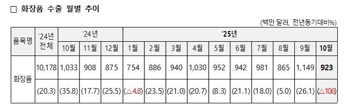10월 화장품 수출이 9개월만에 감소세로 돌아섰다. 1일 산업통상부의 수출입 동향에 따르면 화장품 수출은 9.23억달러(-10.6%)로 나타났다.