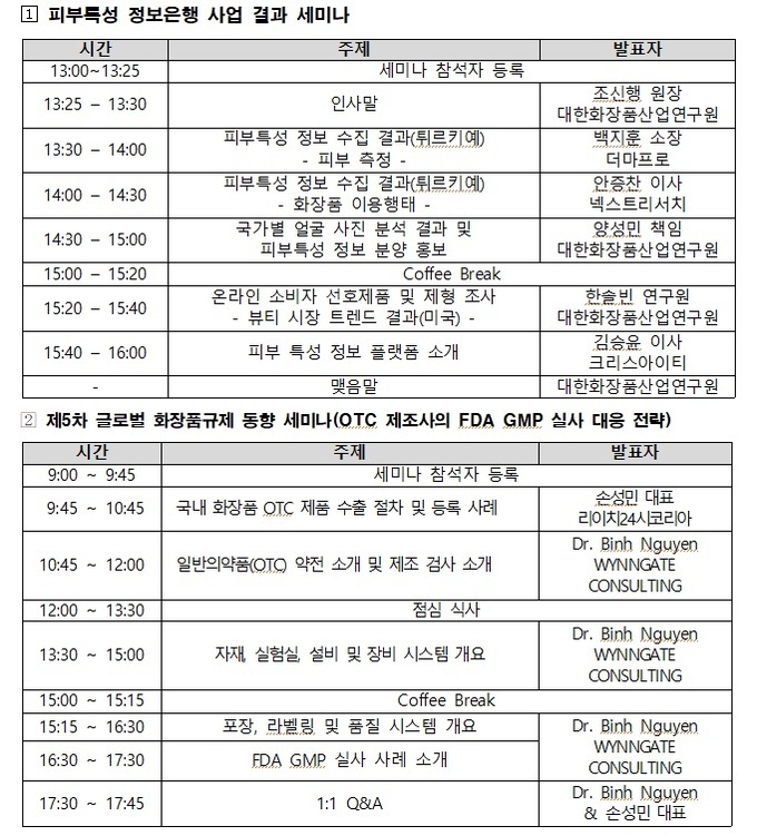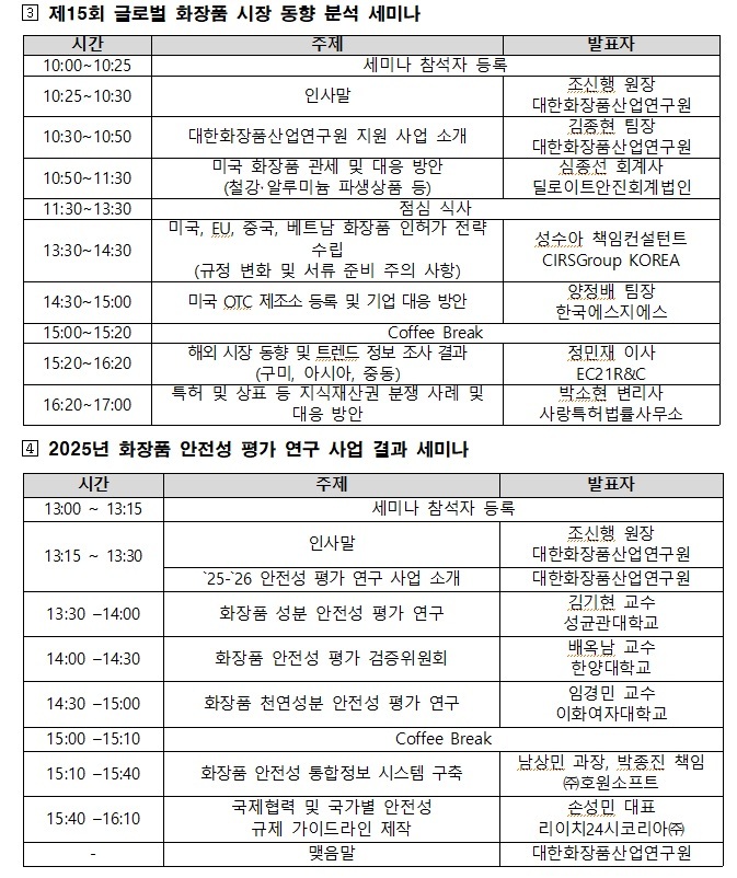 11월 28일(금), 오후 1시부터 코엑스 컨퍼런스룸(남) 318호 「화장품 안전성 평가 연구 사업 결과 세미나」에서 △ 화장품 성분 안전성 연구 및 검증 △ 천연성분 안전성 평가 결과 공유 △ 국가별 규제 가이드라인 비교를 주제로 한 발표가 계획되어 있다.