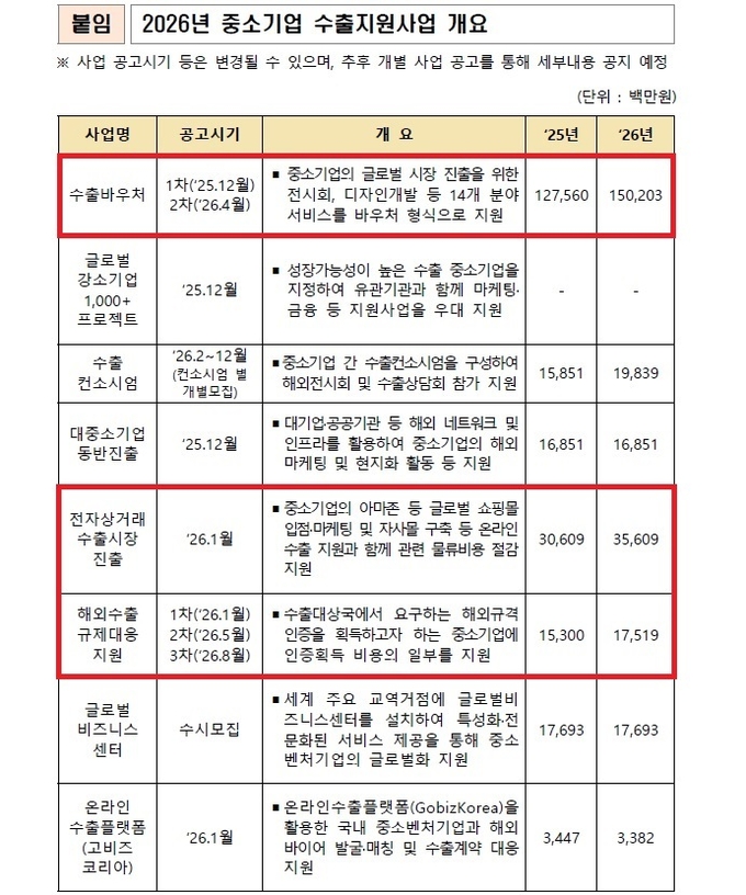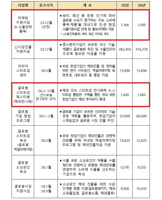 주요 지원내용은 ➊ 수출바우처 1,502억원 편성, 관세 대응 및 물류 지원 확대 ➋ 수출시장 다변화 및 해외진출 촉진 ➌ 유망 K-소비재 분야 수출전략 품목화 ➍ 창업기업 스케일업 및 글로벌 시장 진출 기회 확대 ➎ 소상공인 수출기업 전환 촉진 등이다.