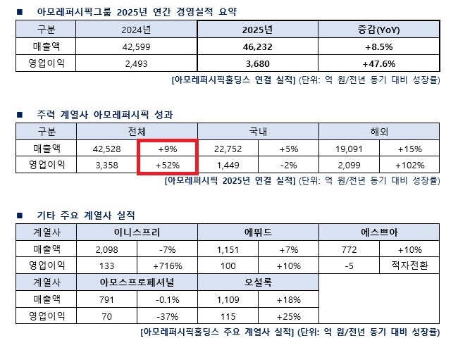 아모레퍼시픽그룹은 2025년 실적에 대해 “북미와 EMEA 시장에서의 지속적인 고성장, 중화권 사업 구조 안정화 및 수익성 개선, 일본 및 APAC 시장의 견고한 성장, 크로스보더 채널을 활용한 신속한 글로벌 신규 시장 진출을 통해 글로벌 핵심 시장 집중 육성(Everyone Global)을 본격화했다”고 자평했다.