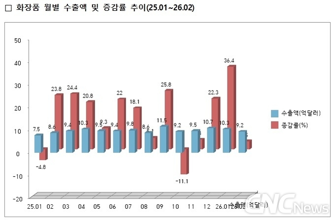 화장품 수출은 1, 2월 순조로운 출발을 보이며, 순항을 알리고 있다. 스킨1004의 칠레·콜롬비아 대형 체인 입점+에콰도르·페루 등 판로 확대, 아모레퍼시픽 라네즈 세포라 브라질 입점 등신흥시장 개척도 활발하다.