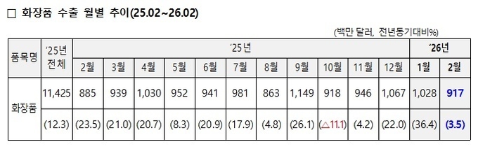2월 화장품 수출이 전년 대비 3.5% 증가하며 4개월째 증가 추세다. 1일 산업통상부의 ‘1월 수출입 동향’에 따르면 화장품 수출액은 9.2억달러로 작년 기저효과에 설 명절 연휴로 인한 조업일수 감소에도 증가세를 보였다는 분석이다.