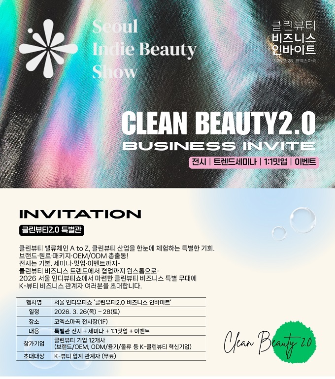 한편, 서울 인디뷰티쇼는 K-뷰티의 주역인 '인디뷰티'의 글로벌 진출을 목표로 출범한 B2B·B2C 융합형 국제 뷰티 전시회다. 2026년 국내에서 열리는 첫 번째 국제 트렌디 뷰티 박람회다. 행사는 무료로 참여 가능하며, 클린뷰티 세미나 및 밋업 신청은 슬록 및 서울 인디뷰티쇼 홈페이지, 구글 신청폼(https://forms.gle/k6mvffBBdJTH8wJ2A) 등에서 3월 23일까지 선착순으로 신청할 수 있다.