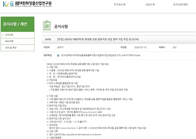 모집 기간은 4월 13일(월)까지이며, 연구원 홈페이지 온라인 접수 (www.kcii.re.kr -> 공지사항 -> 2026년 해외(미국) 화장품 공동 물류지원 사업 참여 기업 모집) 하면 된다. (문의 031-831-5527 / jess@kcii.re.kr)