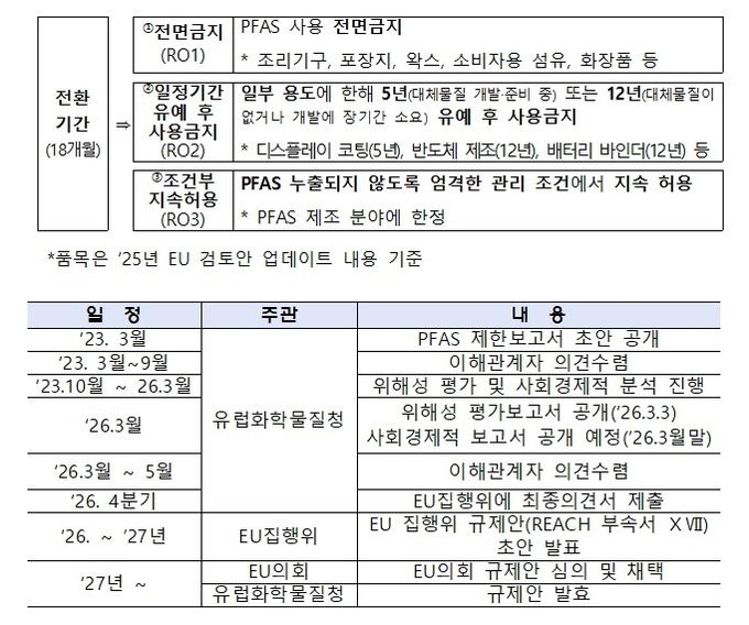 예정대로라면 PFAS 규제(안)은 ’26년 3월 말에 초안이 공개되고 이해관계자 의견수렴(60일, 3월~5월)을 거치게 된다. 이후 ECHA 최종 검토 완료 후 EU 집행위원회가 법제화에 착수하며 실제 시행은 2027년 이후로 예상된다.