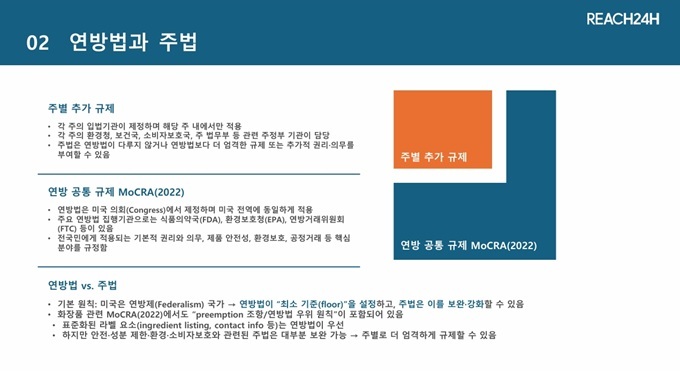 리이치24시코리아 손성민 대표는 미국 연방법과 50개 주별 규제가 시행(예정)되고 있어 미국 수출기업들의 주의를 당부했다. 손 대표는 “연방법 차원(FDA, MoCRA)에서 화장품 규제를 통일적으로 운영하고 있으나 일부 주에선 별도 주법으로 규제하고 있다”고 경고했다.