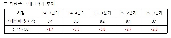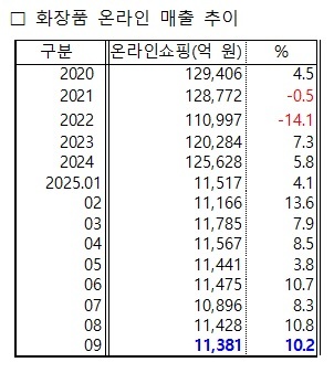 하지만 온라인 매출은 꾸준히 증가하지만 온+오프 합계 화장품 소매판매액은 ‘23년 1분기 이후 ’25년 3분기까지 11분기째 역성장 중이다.