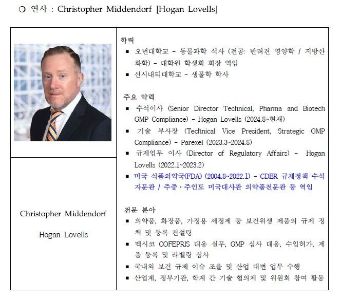 강사는 Christopher Middendorf(Hogan Lovells 수석이사)이며, 그는 미국 식품의약국(FDA) (2004.8~2022.1) - CDER 규제정책 수석자문관 / 주중·주인도 미국대사관 의약품전문관 등 역임했다.