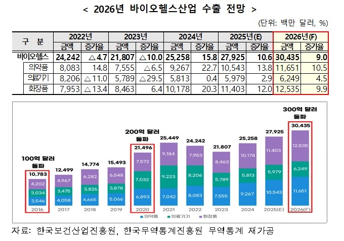 진흥원 이병관 바이오헬스혁신기획단장은 “2025년은 미국과 유럽을 중심으로 주요 품목의 인지도와 수요가 확대되며 바이오헬스산업 수출이 사상 최대 실적을 달성한 한 해가 될 것이다”며, “2026년 바이오헬스 수출은 화장품 산업의 시장 다변화, 미국·유럽 중심의 의약품 산업의 견조한 성장, 의료기기 산업의 수출 회복세에 힘입어 2025년에 이어 다시 한번 최대치를 경신할 것으로 전망된다”고 밝혔다.