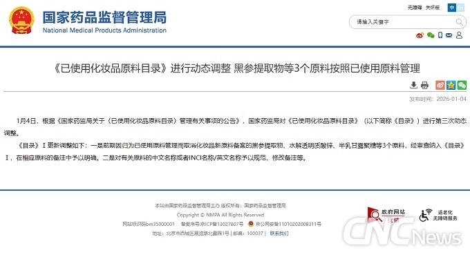 NMPA는 2026년 1월 4일 업데이트를 통해 “‘기사용 화장품 원료 목록’을 동적으로 조정, 흑삼추출물 등 3종 원료를 기사용 원료로 관리” 제목의 공지를 올렸다. 그 내용은 “목록 I의 업데이트 및 조정은 다음과 같다: 첫째, 초기 사용 원료 관리로 취소된 흑인삼 추출물, 가수분해 아연 히알루론산, 갈락토만난 등 세 가지 원료가 검토 후 목록 I에 포함되었으며, 해당 원료 주석에서 명확히 하였다. 둘째는 관련 원자재의 중국어 명칭 또는 INCI 명/영어명을 표준화하고 비고사항을 수정하는 것이다”라는 짧은 글이다.