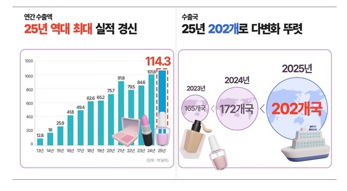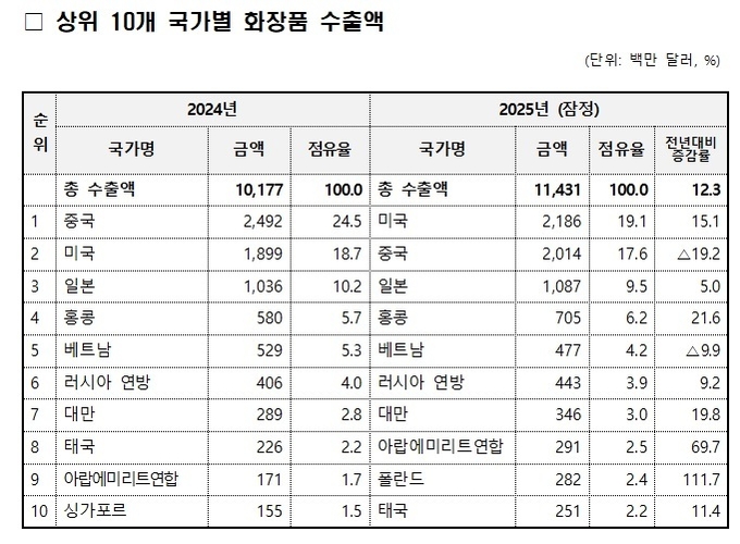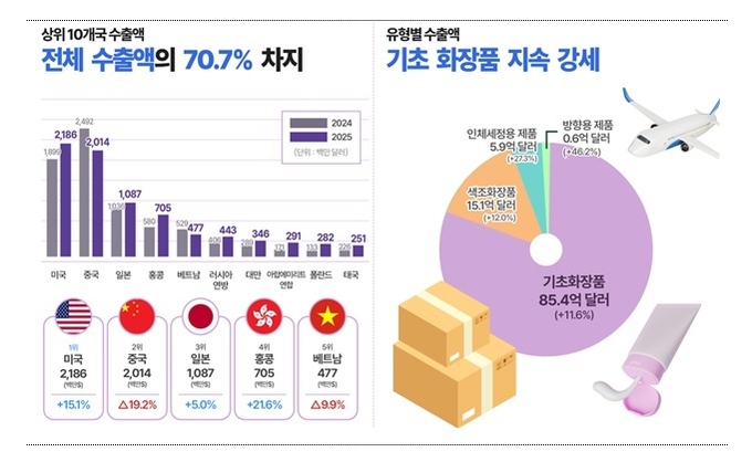 ‘25년 화장품 수출이 114억달러(+12.3%)를 기록 역대 최대치를 경신했다. 식약처에 따르면 화장품 수출은 매달 월별 역대 최고 실적을 기록했으며, 특히 9월은 11.5억달러를 초과하며 월간 역대 신기록을 세우기도 했다. 국가별 수출액은 ▲ 1위 미국(22억달러)으로 ▲ 2위 중국(20억달러)을 처음으로 제쳤다. ▲ 3위 일본(11억달러) 순이었으며, 상위 10개국 수출액이 전체 수출액의 70.7%를 차지했다.