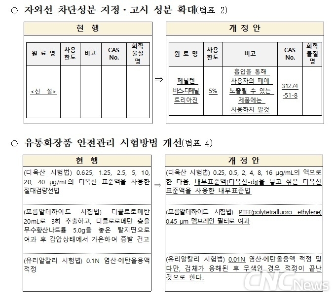 이번 개정안에는 유통화장품 안전관리 시험방법 중 시험검사기관 등 현장에서 제안한 시험법을 반영하여 전처리법을 간소화하는 등 화장품 안전관리의 효율성을 높였다.