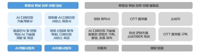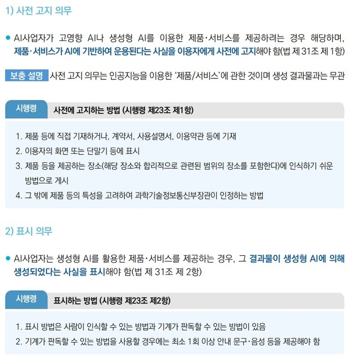 AI기본법의 핵심은 투명성이다. 표시 의무는 생성형 인공지능 제품·서비스를 제공하는 인공지능 사업자에게만 부과된다.