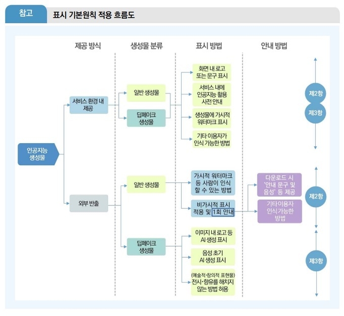 일반 생성물은 모두 비가시적 표시가 가능하다. 딥페이크는 반드시 이용자가 직관적으로 인식할 수 있는 가시적 표시방법만 허용된다.