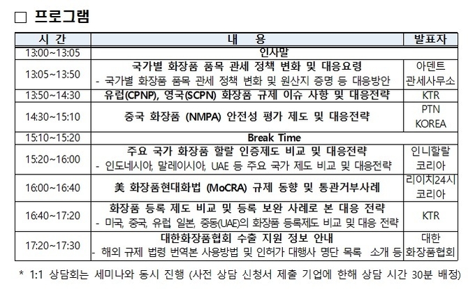 또한, ▲ 미국 MoCRA(화장품규제현대화법)에 따른 美 화장품 규제 동향 및 주요 통관 거부사례, ▲ 주요 화장품 규제 국가인 유럽(영국포함)·중국의 주요 규제 내용 및 대응 전략, ▲ 국가별 할랄제도 간 차이점 및 대응전략 등 화장품 수출 간 겪을 수 있는 다양한 수출규제에 대한 효과적인 대응방법을 소개한다. 이와 더불어 기업과 규제·관세 전문가 간 1:1 애로 상담을 병행하여 참여기업의 수출규제·관세에 대한 맞춤형 애로 해소를 지원한다.