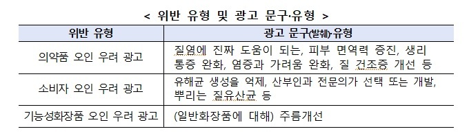 이번 점검에서 일부 업체가 화장품임에도 질염 치료와 같은 의학적 효능, 효과를 내세우거나 질 내 사용이 가능하다는 유도·암시 등 부당 광고를 하는 것으로 파악됐다. 식약처는 소비자 피해를 최소화하기 위해 점검을 실시했다는 설명이다.