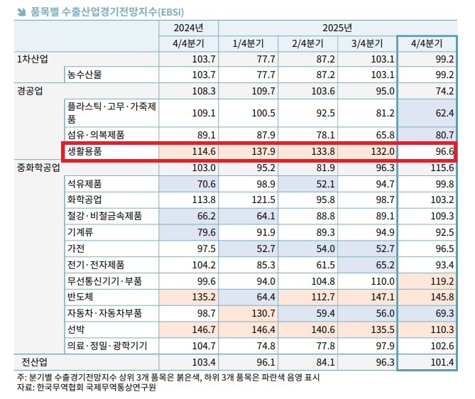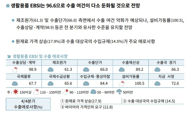 생활용품 EBSI는 114.6(‘24년 4Q) → 137.9 ('25. 1Q) → 133.8 ('25.2Q) → 132.0 ('25.3Q) 흐름을 보였으나 4분기 급락했다. 그 원인으로 원재료 가격 상승(17.9%)과 수출대상국의 수입규제(14.5%)가 주요 애로사항으로 꼽힌다.