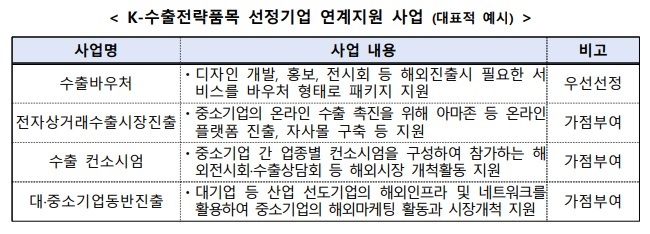 또 선정기업은 △ 부처협업 한류박람회, 동행축제 등에 홍보, 마케팅 지원 △ 해외전시상담회 참가 및 수출상담회 지원 △ 수출바우처 우선 선정, 전자상거래 수출시장 진출 등 가점 유대 등의 혜택을 줄 예정이다.