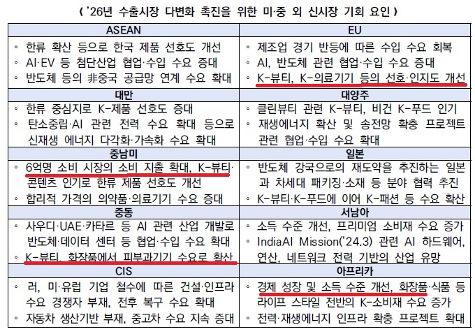 따라서 2026년 화장품 유망시장으로 EU, 대양주, 중남미, 중동, 아프라키 등 6대주를 꼽았다. 특히 ▲ 중동: K-뷰티는 화장품 → 피부과기기 수요로 확산 ▲ 아프리카: 경제 성장 및 소득 수준 개선, 화장품·식품 등 라이프 스타일 전반의 K-소비재 수요 증가 등에서 신시장 기회 요인이 있다고 분석했다.