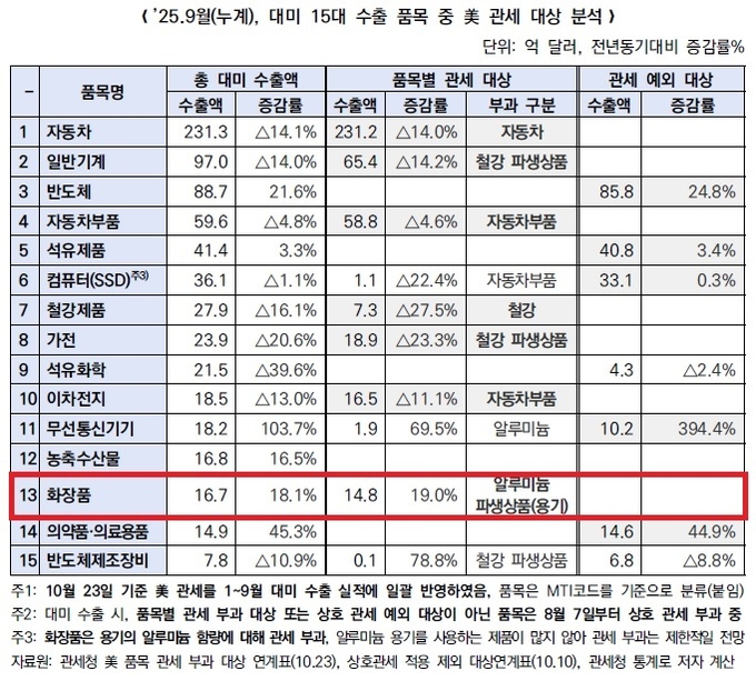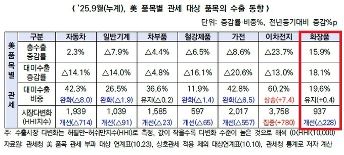 미국의 관세 부과에도 화장품은 미국 수출 1위 유지 및 수출시장 다변화라는 개선 효과가 동시에 나타난 것으로 분석됐다.