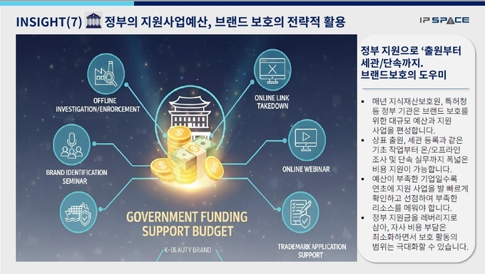 그 방법으로 ➐ 지식재산보호원, 특허청 등 정부기관의 브랜드 보호를 위한 대규모 예산과 지원사업을 활용하는 것이다. 상표출원, 세관등록과 같은 기초작업부터 온/오프라인 조사 및 단속실무까지 폭넓은 비용지원이 가능하다. 예산이 부족한 기업일수록 연초에 지원사업을 발 빠르게 지원해야 한다. 정부 지원금을 레버리지로 삼아, 자사비용 부담은 최소화하면서 보호 활동의 범위는 극대화할 수 있다고 문 대표는 설명했다.