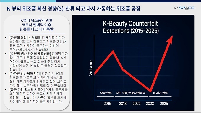 그래프를 보면 2015년 한류 1차 열풍 이후 가라앉다가 사드 갈등 및 팬데믹을 거치면서 K-뷰티 위조품은 하락세였다. 그러다가 2023년 K-뷰티가 글로벌 인기몰이에 나서면서 급작스럽게 한국의 인디/신생 브랜드를 이용한 위조품 대공세가 시작됐다는 것이다.