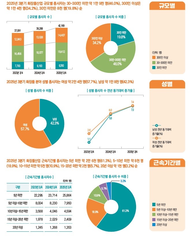 한편 ‘25년 3분기 화장품산업 사업장 수는 1982개이며 종사자 수는 4만 2169명이다. 연령별로 △ 29세 이하 8398명 △ 30~39세 1만 4986명 △ 40~49세 1만 426명 △ 50~59세 6692명 △ 60세 이상 1688명이다. 비중은 30~39세가 35.5% > 40~49세 24.7% > 29세이하 19.9% 순이이다. 성별 비중은 여성 57.7% > 남성 42.3% 이다. 5년 미만 근속자가 61.3%로 가장 많았다.