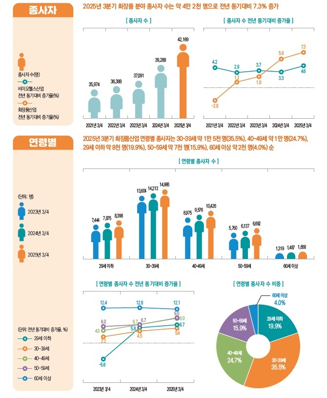 보건산업진흥원은 “화장품 산업은 7분기 연속 바이오헬스산업 내 가장 높은 증가율을 기록했다. 특히 29세 이하(청년층) 종사자 수가 6.7% 증가하면서 청년층 고용이 뚜렷하게 확대되고 있으며, 모든 규모의 사업체에서 고용 확대로 균형 성장 흐름을 이어가고 있다”라고 분석했다.