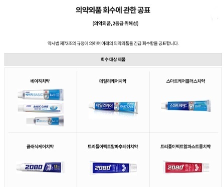 이어 "고객 안전을 최우선으로 고려해 사실을 확인한 즉시 해당 제품에 대한 수입 및 출고를 중단하고 제조일자와 상관없이 해당 6종 제품 전량에 대해 자발적 회수를 결정하게 됐다"며 "안내드리는 회수 대상 제품 외 모든 치약은 국내에서 생산되고 있으며 품질과 성분에 문제가 없음을 말씀드린다"고 안내했다.끝으로 "이번 일로 인해 고객님들께 불편과 심려를 끼쳐드려 진심으로 사과드린다"며 "이번 일을 계기로 모든 제품에 대해 품질 관리 및 생산 전 과정을 철저히 점검하고 이러한 일이 다시는 재발되지 않도록 관리에 만전을 기하도록 하겠다"고 덧붙였다.