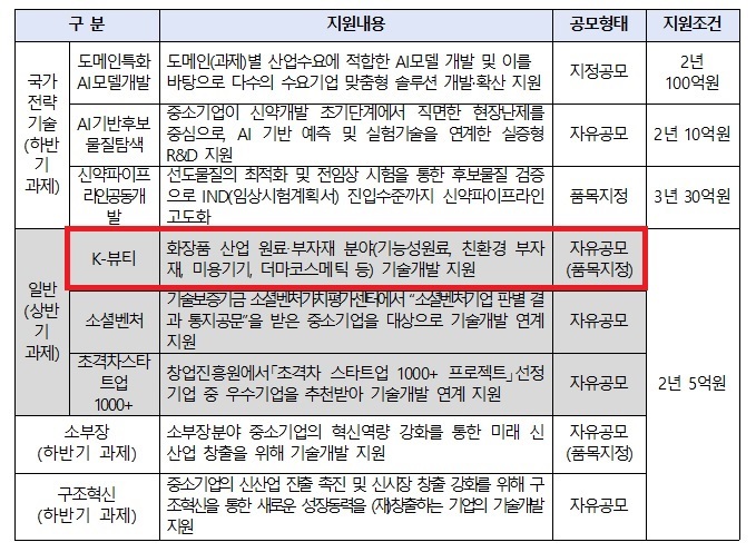 중소벤처기업부는 K-뷰티 분야 10개 기업에 2년간 최대 5억원을 지원해주는 ‘2026 중소기업 기술혁신개발사업’ 참여 기업을 모집한다.