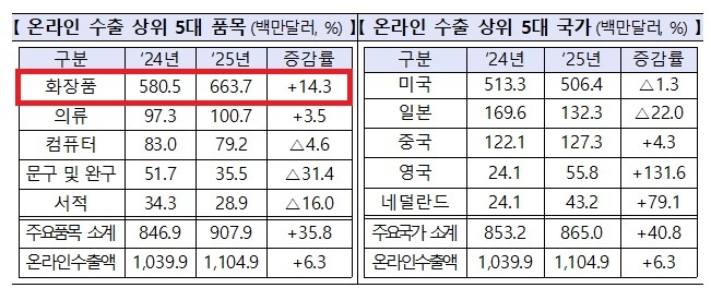 한편 온라인 수출은 화장품이 6.6억달러로 전년 대비 14.3% 증가했다. 영국(+261.7%), 네덜란드(+138.0%) 등 유럽 수출이 급증하며 실적을 견인했다.