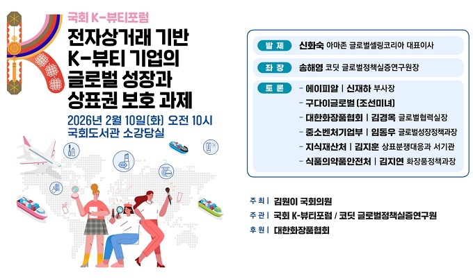 국회 K-뷰티포럼(대표의원 김원이)은 오는 2월 10일(화) 오전 10시 국회도서관 소강당실에서 ‘전자상거래 기반 K-뷰티 기업의 글로벌 성장과 상표권 보호 과제’ 세미나를 개최한다고 2일 밝혔다.