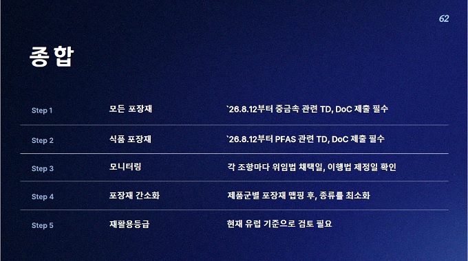유럽 포장 및 포장폐기물 규정(PPWR, 25.2.11 발효)에 따라 ‘26년 8월 12일부터 모든 포장재의 PFAS·중금속 제한이 시행된다. 또한 등록 양식 통일 및 라벨 표준화도 적용될 예정이다.