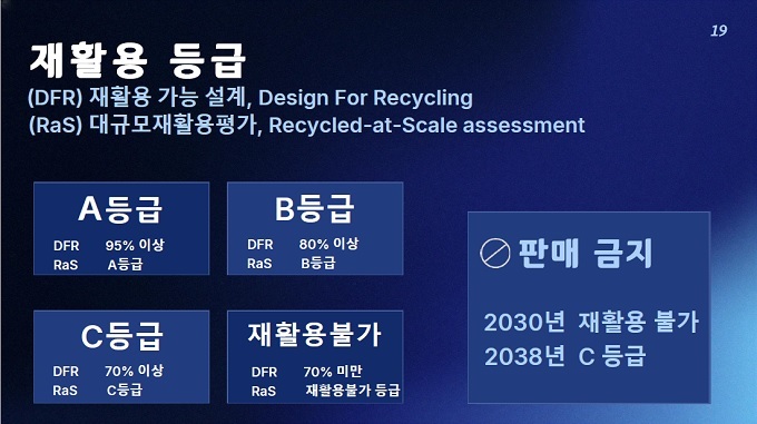 재활용 등급(DFR)은 대규모재활용 평가(Recycled-at-Scale assessment)를 거쳐 구분된다. ▲ RaS A등급은 DFR 95% 이상 ▲ Ras B 등급은 DFR 80% 이상 ▲ RaS C 등급은 DFR 70% 이상 ▲ 재활용 불가는 DFR 70% 미만으로 구분된다. 판매금지 시점으로 ’재활용불가‘는 2030년, C등급은 2038년 판매 금지된다.
