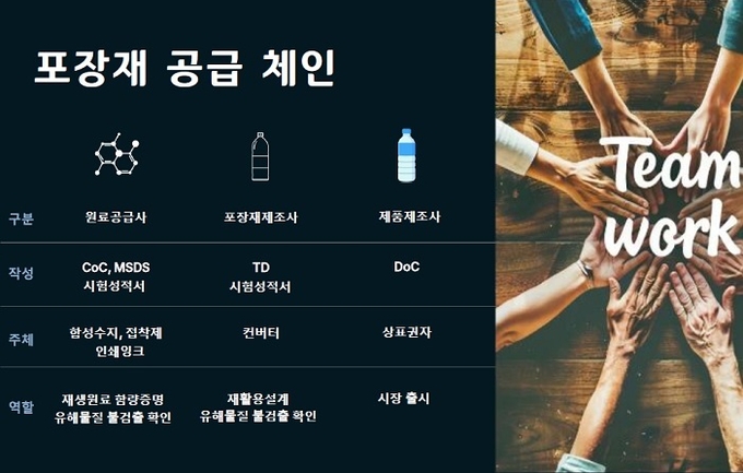 환경 공단 관계자는 포장재 공급 체인별로 팀웍으로 상호 보완해야 한다고 강조했다. 즉 원료 공급사, 포장재제조사, 제품 제조사 간 작성+주체+역할 등에서 협의가 필요하다.