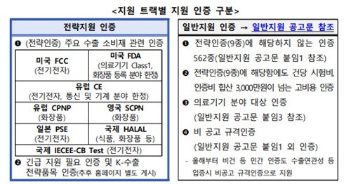 해외규격인증획득지원사업은 ➊ 전략지원 인증(9종) ➋ 일반지원 인증의 투 트랙으로 지원된다. 전략지원 인증은 화장품의 경우 △ 유럽 CPNP △ 영국 SCPN △ 국제 HALAL △ 미국 FDA 등이 대상이다. 일반지원은 전략인증에 해당되지 않는 인증 562종이다.