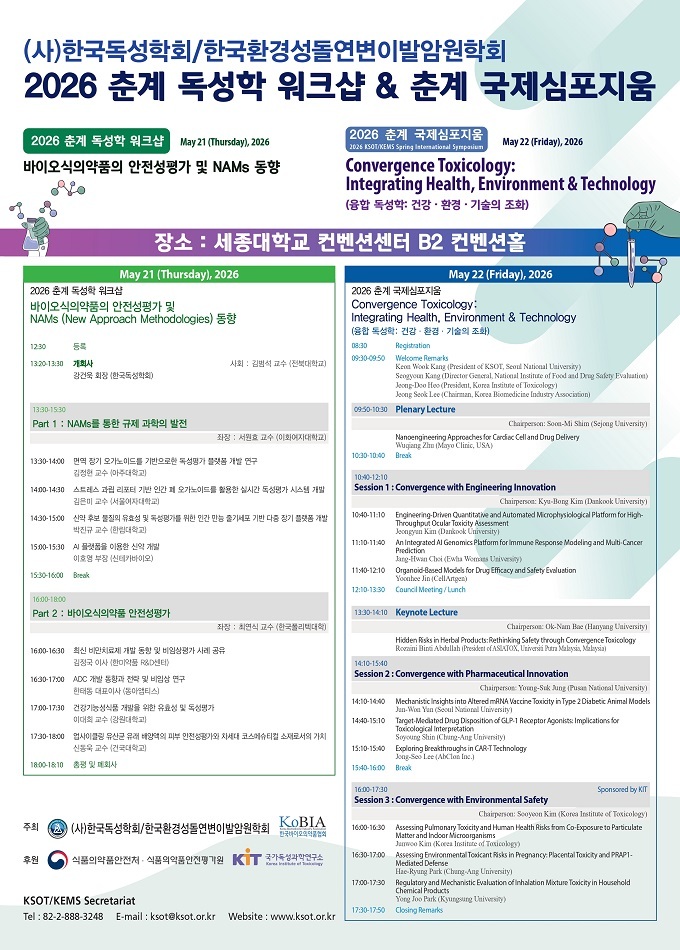 학술 프로그램은 “바이오식의약품의 안전성평가 및 NAMs 동향”을 주제로 한 워크샵과 “융합 독성학: 건강·환경·기술의 조화(Convergence Toxicology: Integrating Health, Environment & Technology)”를 주제로 한 국제심포지움으로 구성된다.