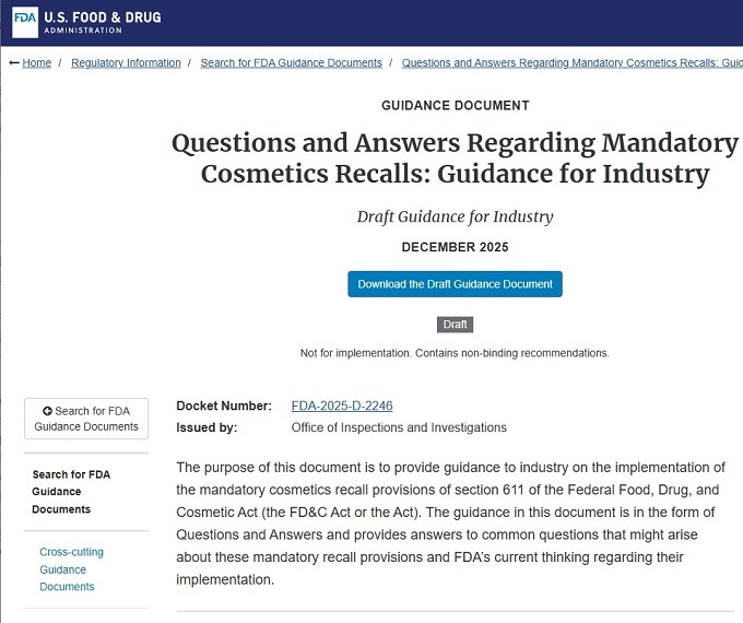 미국 FDA가 화장품 의무 리콜 권한 행사 기준과 절차를 담은 가이던 초안 ‘화장품 의무 리콜에 관한 질의응답: 업계를 위한 가이던스(Questions and Answers Regarding Mandatory Cosmetics Recalls: Guidance for Industry)’를 관보에 공식 발표했다.(25. 12. 18)