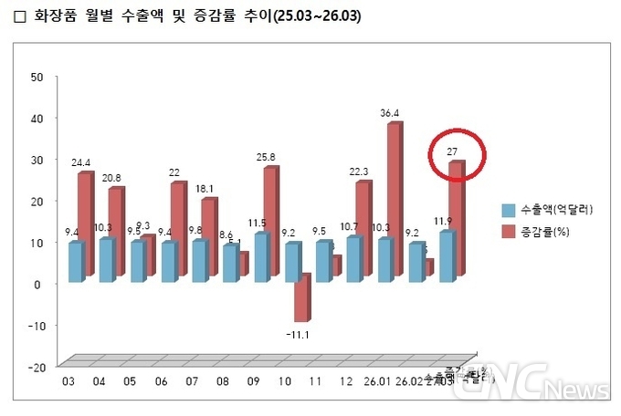 3월 화장품 수출이 11.9억달러(+27%)를 기록하며 월간 신기록을 작성했다. 4월 1일 산업통상자원부의 3월 수출입 동향에 따르면 화장품 수출액은 12억달러에 육박, 역대 최고 신기록을 작성한 것으로 나타났다. 월별 증가율도 지난 1월(36%)에 이은 두 번째로 높다.