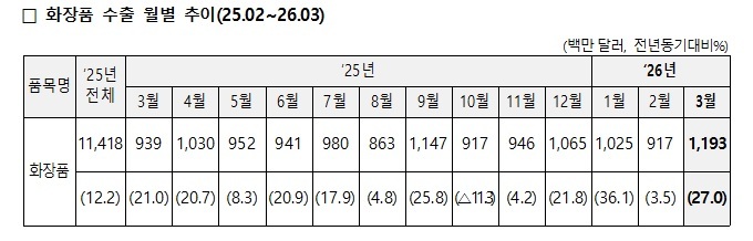 이로써 화장품 수출은 5개월째 증가세를 유지했다. 1분기 수출액은 31.4억달러로 ‘25년 1분기(25.5억달러)에 비해 23% 증가했다. 이는 ’25년 수출 증가율 12%에 비해 두 배나 높은 기록. 20%대 증가 추세를 유지한다면 ‘26년 수출액은 137억달러를 기록할 것으로 예상된다.